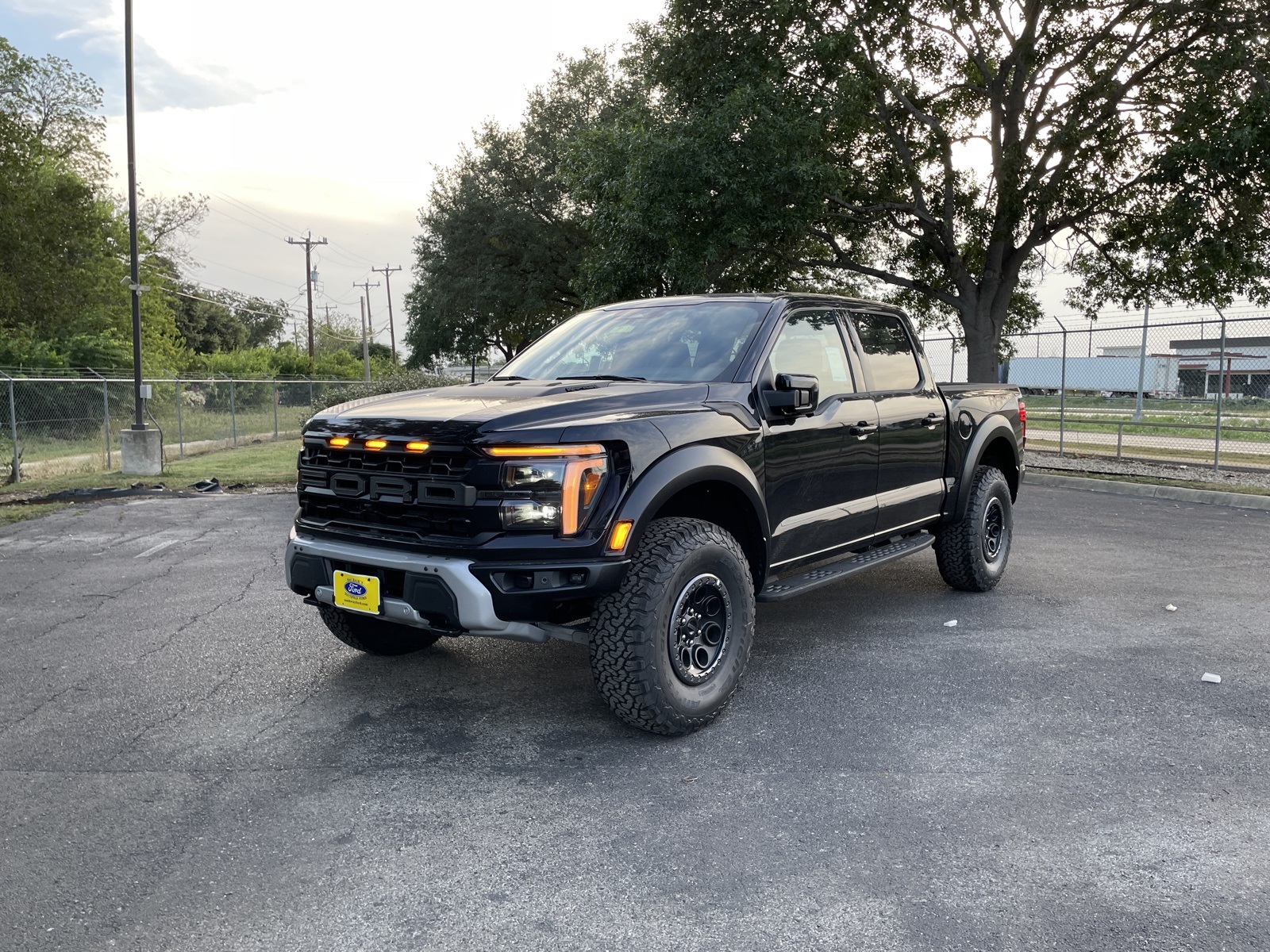 This 2025 Ford F-150 Raptor in Agate Black Metallic includes the following features: 3.5L V6 EcoBoost® 10-Speed Automatic 4WD Equipment Group 802A Raptor 37 (Carbon Fiber Interior Appliques, Dual Valve Shocks, Modular Front Bumper, and Wheels: Raptor 37 Unique 17″ Cast Aluminum), 4WD, 14 Speakers, 17″ Cast Aluminum Wheels, 4-Wheel Disc Brakes, ABS brakes, Adjustable pedals, Air Conditioning, Alloy wheels, AM/FM radio: SiriusXM with 360L, Auto High-beam Headlights, Auto tilt-away steering wheel, Auto-dimming door mirrors, Auto-dimming Rear-View mirror, Automatic temperature control, Brake assist, Bumpers: body-color, Compass, Delay-off headlights, Driver door bin, Driver vanity mirror, Dual front impact airbags, Dual front side impact airbags, Electronic Locking w/4.10 Axle Ratio, Electronic Stability Control, Emergency communication system: SYNC® 4 911 Assist, Front anti-roll bar, Front Bucket Seats, Front Center Armrest, Front dual zone A/C, Front fog lights, Front License Plate Bracket, Front reading lights, Front wheel independent suspension, Fully automatic headlights, Garage door transmitter, Heads-Up Display, Heated door mirrors, Heated front seats, Heated rear seats, Heated steering wheel, Illuminated entry, Lane Departure Warning System, Leather steering wheel, Low tire pressure warning, Memory seat, Navigation system: Connected Navigation, Occupant sensing airbag, Outside temperature display, Overhead airbag, Overhead console, Panic alarm, Passenger door bin, Passenger vanity mirror, Pedal memory, Power door mirrors, Power driver seat, Power passenger seat, Power steering, Power windows, Radio data system, Radio: B&O Unleashed Sound System by Bang & Olufsen, Rain sensing wipers, Rear reading lights, Rear step bumper, Rear window defroster, Remote keyless entry, Security system, Speed control, Speed-sensing steering, Split folding rear seat, Steering wheel memory, Steering wheel mounted audio controls, SYNC® 4 w/Enhanced Voice Recognition, Tachometer, Telescoping steering wheel, Tilt steering wheel, Traction control, Trip computer, Turn signal indicator mirrors, Twin Panel Moonroof, Variably intermittent wipers, and Ventilated front seats.