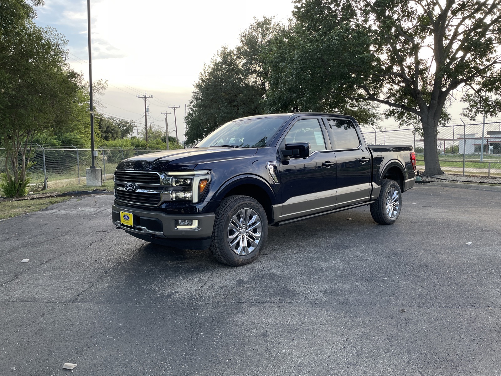 This 2025 Ford F-150 King Ranch in Antimatter Blue Metallic includes the following features: 3.5L V6 EcoBoost® 10-Speed Automatic 4WD Equipment Group 601A High, FX4 Off-Road Package (4×4 FX4 Off-Road Bodyside Decal, Hill Descent Control, Monotube Rear Shocks, Off-Road Tuned Front Shock Absorbers, and Rock Crawl Mode), 4WD, 14 Speakers, 4-Wheel Disc Brakes, ABS brakes, Adjustable pedals, Air Conditioning, Alloy wheels, AM/FM radio: SiriusXM with 360L, Auto High-beam Headlights, Auto tilt-away steering wheel, Auto-dimming door mirrors, Auto-dimming Rear-View mirror, Automatic temperature control, Brake assist, Chrome wheels, Compass, Delay-off headlights, Driver door bin, Driver vanity mirror, Dual front impact airbags, Dual front side impact airbags, Electronic Locking w/3.55 Axle Ratio, Electronic Stability Control, Emergency communication system: SYNC® 4 911 Assist, Front anti-roll bar, Front Bucket Seats, Front Center Armrest, Front dual zone A/C, Front fog lights, Front License Plate Bracket, Front reading lights, Front wheel independent suspension, Fully automatic headlights, Garage door transmitter, Genuine wood dashboard insert, Heads-Up Display, Heated door mirrors, Heated front seats, Heated rear seats, Heated steering wheel, Illuminated entry, King Ranch Multicontour Leather Bucket Seats, Leather steering wheel, Low tire pressure warning, Max Tow Electronic Locking w/3.55 Axle Ratio, Memory seat, Navigation system: Connected Navigation, Occupant sensing airbag, Outside temperature display, Overhead airbag, Overhead console, Panic alarm, Passenger door bin, Passenger vanity mirror, Pedal memory, Power door mirrors, Power driver seat, Power moonroof, Power passenger seat, Power steering, Power windows, Radio data system, Radio: B&O Unleashed Sound System by Bang & Olufsen, Rain sensing wipers, Rear reading lights, Rear seat center armrest, Rear step bumper, Rear window defroster, Remote keyless entry, Security system, Speed control, Split folding rear seat, Steering wheel memory, Steering wheel mounted audio controls, SYNC® 4 w/Enhanced Voice Recognition, Tachometer, Telescoping steering wheel, Tilt steering wheel, Traction control, Trip computer, Turn signal indicator mirrors, Variably intermittent wipers, Ventilated front seats, Voltmeter, and Wheels: 20″ Chrome-Like PVD.